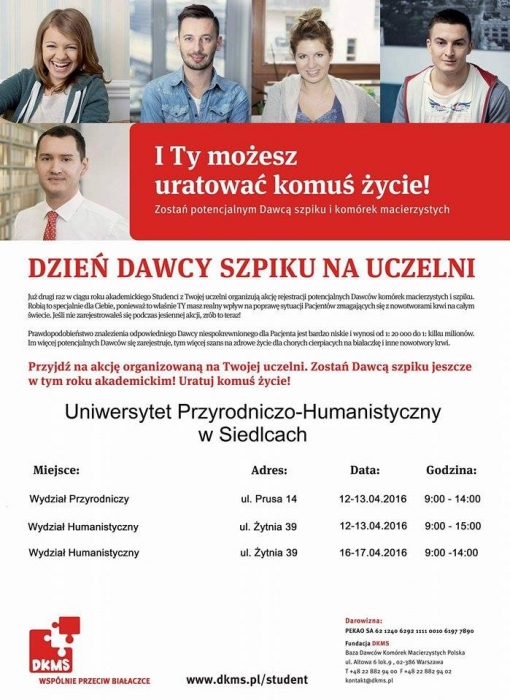 Już od przyszłego tygodnia w kilku lokalizacjach na Uniwersytecie Przyrodniczo - Humanistycznym będzie można zarejestrować się do bazy dawców komórek macierzystych. Miejsca rejestracji są otwarte zarówno dla studentów jak i osób spoza uczelni.