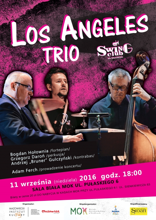 L. A. TRIO powstało w 1994 roku. Gra muzykę w klimacie tak bardzo charakterystycznym dla Zachodniego Wybrzeża USA. Nienagannie elegancka, klarowna, relaksująco - swingująca, unosząca w sobie zapach promenad nadmorskich i dyskretny urok luksusowych nocnych klubów – „Miasta Aniołów”. Liderem a zarazem duszą i natchnieniem tria jest Bogdan Hołownia: wybitny pianista, ceniony i lubiany w środowiskach jazzowych po obu stronach oceanu. (Dyplom Berklee College of Music w Bostonie). Olbrzymia wiedza muzyczna, doświadczenia niezliczonych koncertów oraz natura muzyka ciągle poszukującego nowych dróg, zapewniają mu zasłużenie godne miejsce wśród elity pianistów jazzowych. Na kontrabasie towarzyszy mu Andrzej „Bruner” Gulczyński, niegdyś basista legendarnej „Nocnej Zmiany Bluesa”, obecnie prowadzący własny kwartet jazzowy „Brunerschaft”. Z racji bardzo wysokich umiejętności muzycznych zapraszany do współpracy przez wielu muzyków i zespoły jazzowe. Podczas koncertu w Siedlcach na perkusji zagra utalentowany muzyk i zarazem kompozytor - Grzegorz Daroń. Skomponował on muzykę do filmów fabularnych (Młode Wilki), dokumentalnych, seriali (Na Wspólnej, Rodzinka), programów telewizyjnych, przedstawień teatralnych. Jest także autorem piosenek i producentem płyt. Jako perkusista koncertował w różnych formach jazzowych i rockowych, współpracując z wszystkimi znaczącymi muzykami bydgoskimi i z krajową czołówką, m.in. z zespołem Justyny Steczkowskiej oraz z polsko-angielskim zespołem Roy Benett Group.