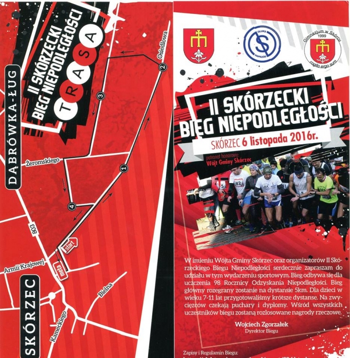 6 listopada dla uczczenia 98 Rocznicy Odzyskania Niepodległości w Skórcu zawodnicy zmierzą się z dystansem 5km. Dla dzieci w wieku 7 -11 lat przygotowano krótsze dystanse.