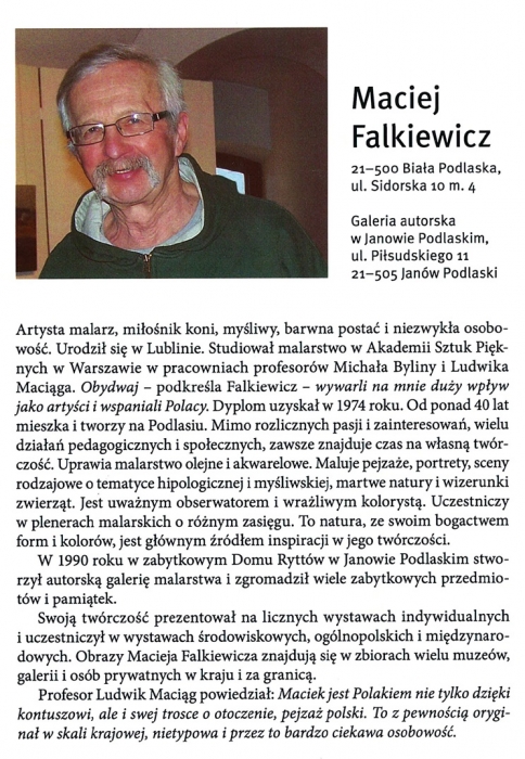 Od 17 lutego do 26 marca 2017 r. w Muzeum Regionalnym w Siedlcach będzie prezentowana wystawa malarstwa Macieja Falkiewicza. Na wystawie znajdą się obrazy olejne, akwarele i pastele które powstały w różnych okresach twórczości tego artysty.