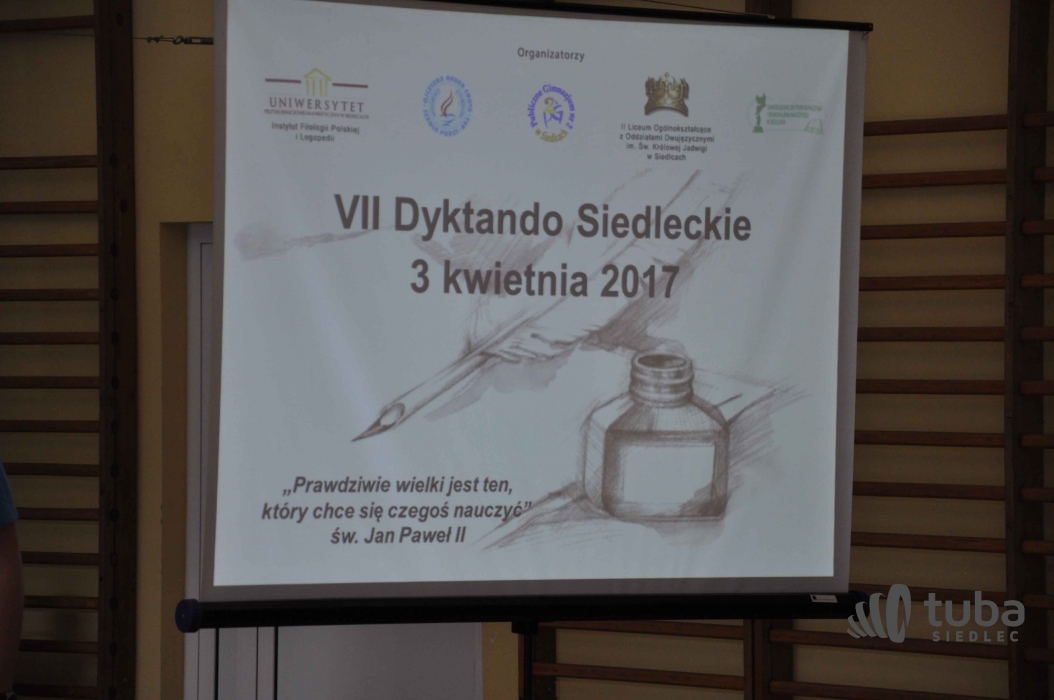 3 kwietnia był dniem, w którym odbyły się w kilku placówkach finałowe fazy VII Siedleckiego Dyktanda. Do tego etapu dotarli zwycięzcy wewnętrznych eliminacji - najczęściej po trzech najlepszych uczniów z każdej szkoły. Finaliści rywalizowali w następujących kategoriach: klasy I-III w SP 4, gimnazja w PG 2, uczniowie szkół ponadgimnazjalnych w II LO, studenci pisali swoje dyktanda w UPH, natomiast później tego samego dnia w szranki z polską ortografią stanęli rodzice.