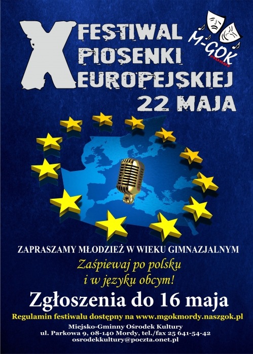 Już po raz dziesiąty odbędzie się Festiwal Piosenki Europejskiej organizowany przez Miejsko-Gminny Ośrodek Kultury w Mordach. Zgłoszenia młodzieży są przyjmowane do 16 maja.