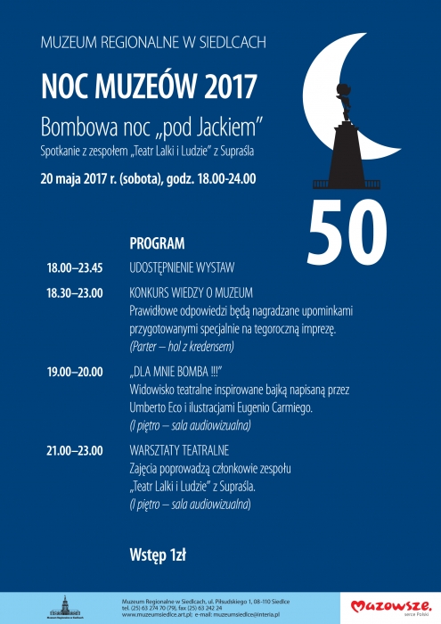 Tegoroczna edycja Nocy Muzeów w siedleckim muzeum odbywać się będzie pod hasłem Bombowa noc „pod Jackiem”. W godzinach między 18.00 a 23.45 będzie można oglądać wszystkie aktualnie prezentowane w tej placówce wystawy muzealne.