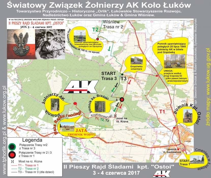 Dwudniowy Rajd będzie prowadził trzema trasami – z Łukowa, z Wiśniewa i z Gręzówki, przez Lasy Łukowskie, do bazy przy zbiorniku wodnym w rezerwacie Jata. Długość tras wynosi 28 km, 25 km, 10 km. Rodziny z dziećmi będą mogły przejść najkrótszą z tras. Poza przemarszem, organizatorzy - Światowy Związek Żołnierzy AK Koło Łuków, Towarzystwo Przyrodniczo – Historyczne „Orlik”, Łukowskie Stowarzyszenie Rozwoju oraz gminy Łuków i Wiśniew, zapraszają na wspólne biesiadowanie i śpiewanie pieśni patriotycznych przy ognisku. W programie drugiego dnia znajdują się: polowa msza św., prezentacja uzbrojenia, umundurowania i wyposażenia żołnierskiego, diorama obozu partyzanckiego z udziałem Grupy Rekonstrukcji Historycznej „Wir”, a także szereg konkursów i atrakcji dla dzieci i dorosłych.