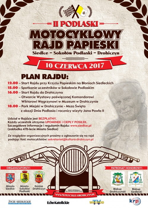 W sobotę, 10 czerwca wyruszy z Siedlec do Drohiczyna II Podlaski Motocyklowy Rajd Papieski. Początek rajdu o 12.00 na Błoniach Siedleckich. Patronat honorowy nad wydarzeniem objęli: Biskup Siedlecki Kazimierz Gurda i Biskup Drohiczyński Tadeusz Pikus.