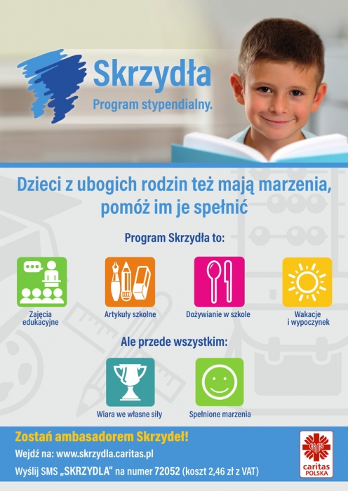 W Caritas Diecezji Siedleckiej rusza nabór do programu stypendialnego dla dzieci i młodzieży pn. „Skrzydła”. Dzięki wsparciu darczyńców, dzieci otrzymają środki na pokrycie wydatków związanych z nauką w szkole.