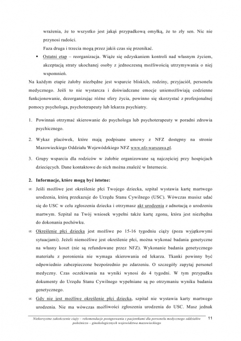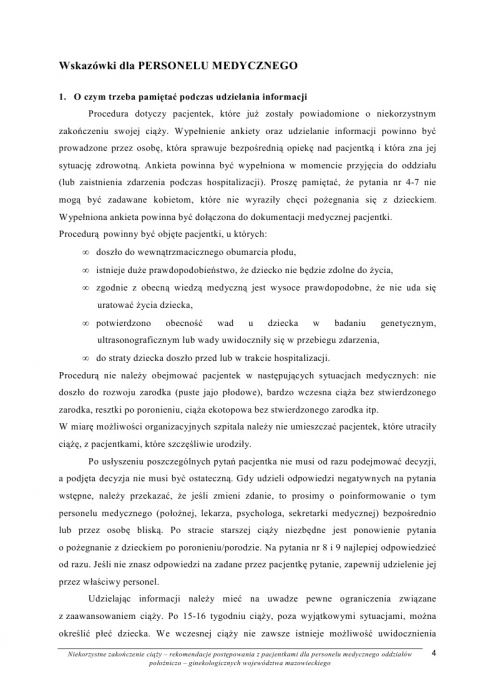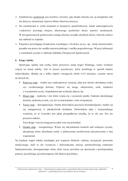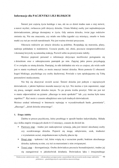 Większość szpitali nie ma uregulowanych zasad postępowania z pacjentkami po niekorzystnym zakończeniu ciąży. Rekomendacje mają służyć zapewnieniu kobietom, które tego chcą, godnego pożegnania się z dzieckiem i zachowania po nim pamiątek. Nie mają natomiast na celu narzucania pacjentkom konkretnych zachowań czy procedur. Załączona ankieta ma pomóc wysondować, czy kobieta potrzebuje wsparcia i czy chce w ogóle rozmawiać o tym, co ją spotkało. Dokument zawiera również pakiet podstawowych informacji, m.in. dotyczących urlopu macierzyńskiego, zasiłku macierzyńskiego i ewentualnie pogrzebowego*. Zwraca też uwagę na zaproponowanie pomocy psychologicznej pacjentce i ojcu dziecka.