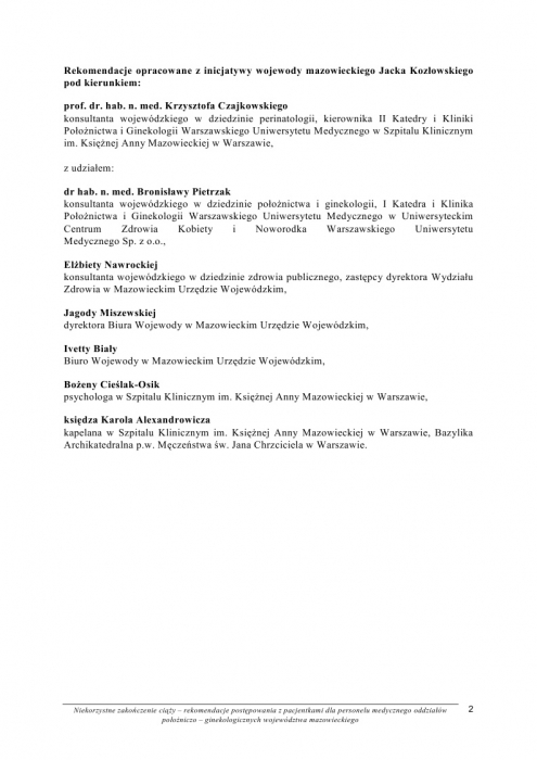 Zespół opracowujący rekomendacje został powołany z inicjatywy wojewody Jacka Kozłowskiego. W jego skład weszli konsultanci wojewódzcy w dziedzinach perinatologii (prof. dr hab. n. med. Krzysztof Czajkowski) oraz położnictwa i ginekologii (dr Bronisława Pietrzak), psycholog, ksiądz, a także przedstawiciele Mazowieckiego Urzędu Wojewódzkiego.