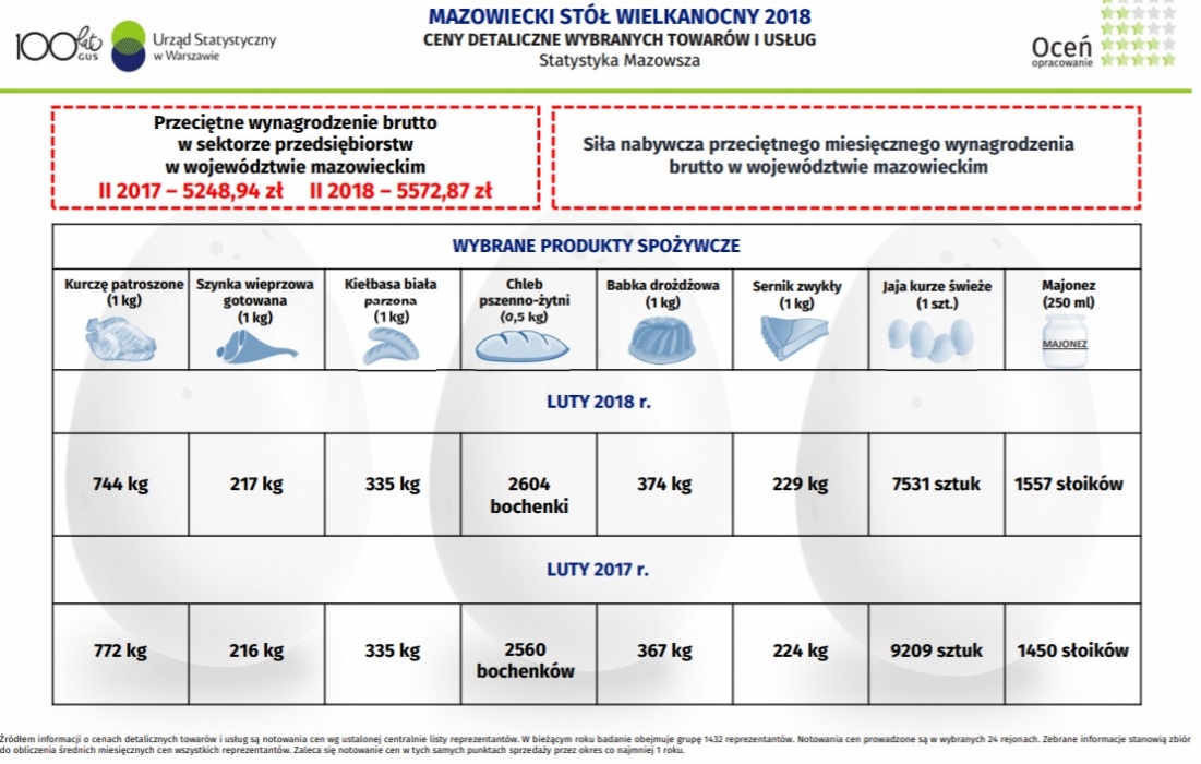 Według danych przekazanych przez Urząd Statystyczny w Warszawie, na Mazowszu jaja będą droższe, aż o 29,8 %, masło o 26,8 %, zaś biała kiełbasa w cenie wyższej o 6,1 % niż przed rokiem.