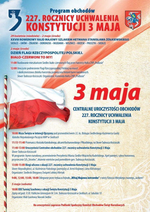 Znamy już program obchodów uroczystości Święto Konstytucji 3 Maja w Siedlcach. Dzień ten upamiętnia uchwalenie pierwszej konstytucji w nowożytnej Europie (drugiej na świecie) w 1791 roku.