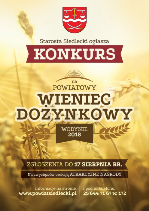 Starosta Siedlecki ogłasza konkurs na powiatowy wieniec dożynkowy 2018. Rozstrzygnięcie konkursu połączone z wyborem zwycięskiego wieńca nastąpi podczas Dożynek Powiatu Siedleckiego, 26 sierpnia w Wodyniach.