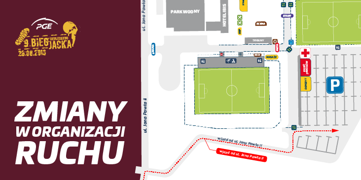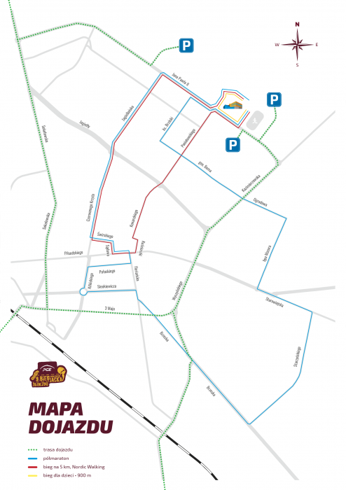 Przypominamy, że w dniu Biegu wystąpią utrudnienia w ruchu, ze względu na zamknięte na czas Biegu ulice - od 8 do 12. Jak zatem sprawnie dojechać na Bieg? Sugerowany dojazd to ulicą 3 Maja – Wyszyńskiego – Kazimierzowską, a następnie drogą gruntową przy stadionie na parking główny.