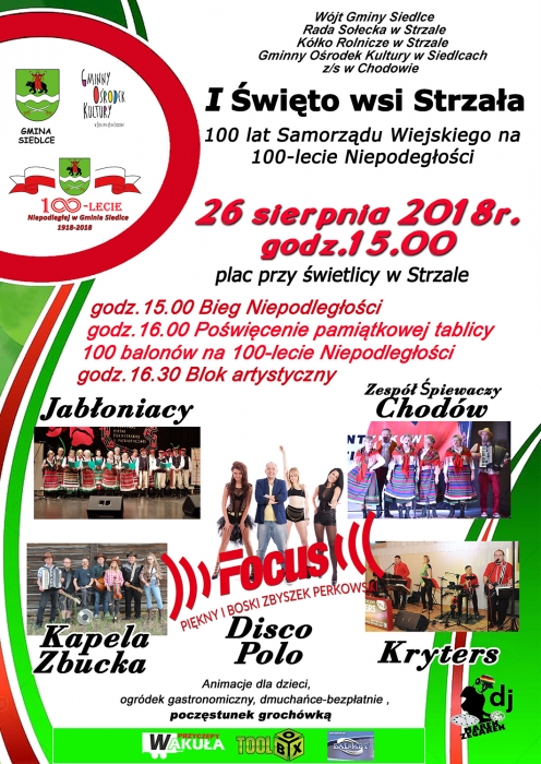 Wójt Gminy Siedlce, Rada Sołecka w Strzale, Kółko Rolnicze w Strzale, Gminny Ośrodek Kultury w Siedlcach z/s w Chodowie zapraszają na I Święto wsi Strzała i 100 lat Samorządu Wiejskiego na 100 - lecie Niepodległości.