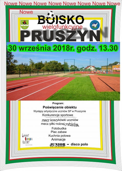 Rada Gminy Siedlce, Wójt Gminy Siedlce, Dyrektor Szkoły Podstawowej w Pruszynie, Gminny Ośrodek Kultury w Siedlcach z/s w Chodowie zapraszają dnia 30 września o godz. 13.30 na otwarcie boiska wielofunkcyjnego w Pruszynie.