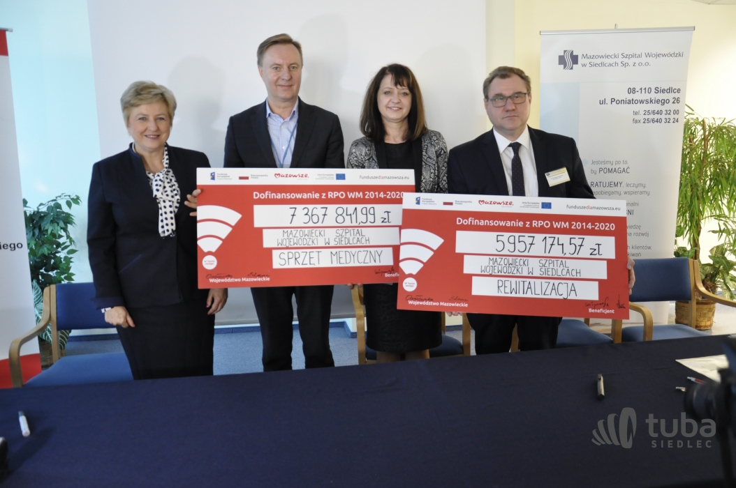 Dziś (06.11) w południe, w sali konferencyjnej szpitala przy ul. Poniatowskiego w Siedlcach przedstawiciele Sejmiku Województwa Mazowieckiego oraz Mazowieckiego Szpitala Wojewódzkiego w Siedlcach spotkali się, by podpisać umowę o dofinansowanie dwóch projektów w ramach Regionalnego Programu Operacyjnego Województwa Mazowieckiego 2014-2020. W imieniu inwestora podpisy złożyli: Marcin Kulicki prezes zarządu w Mazowieckim Szpitalu Wojewódzkim i członek zarządu szpitala Dariusz Młynarczyk, natomiast po stronie sejmiku: Janina Ewa Orzełowska wicemarszałek i członek zarządu województwa mazowieckiego Elżbieta Lanc.