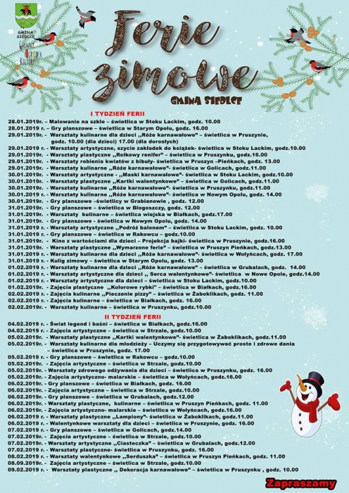 Tegoroczna oferta GOK w Siedlcach z siedzibą w Chodowie na ferie zimowe jest wyjątkowa. Zajęcia odbywają się codziennie, w każdej z gminnych świetlic. W poszczególnych miejscowościach mają różną tematykę i wzajemnie się uzupełniają. Każdy znajdzie coś dla siebie!