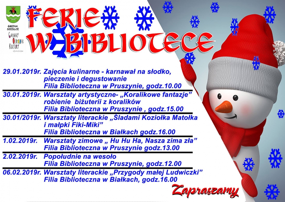 Ofertę uzupełniają zajęcia w filiach Gminnej Biblioteki Publicznej w Białkach i Pruszynie „Ferie w Bibliotece”. Biblioteki zapraszają na zajęcia kulinarne, warsztaty artystyczne i literackie. Szczegóły na plakatach.