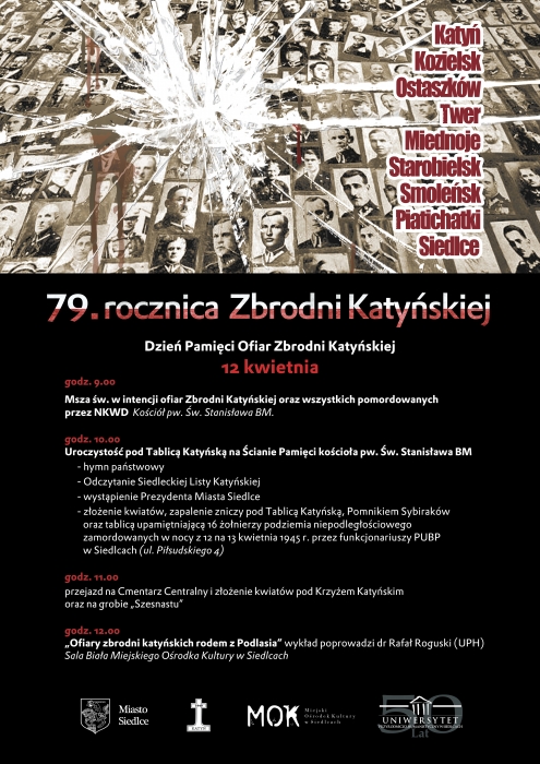 godz. 12.00 - Wykład „Ofiary zbrodni katyńskich rodem z Podlasia” ‑ dr Rafał Roguski (UPH) Sala Biała Miejskiego Ośrodka Kultury w Siedlcach