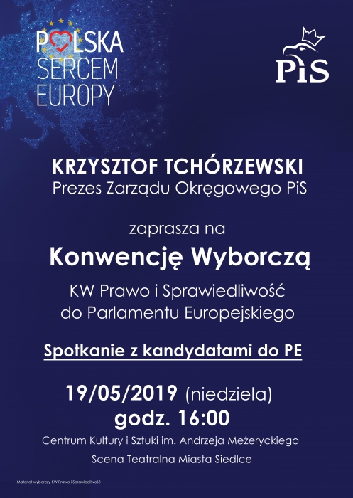 W niedzielę 19 maja, o godz. 16:00 w Centrum Kultury i Sztuki im. Andrzeja Meżeryckiego Scena Teatralna Miasta Siedlce, ul. Bpa Ignacego Świrskiego 31 w Siedlcach odbędzie się konwencja wyborcz Prawa i Sprawiedliwości. Jest to kolejna z cyklu konwencji regionalnych.