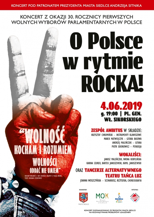 4 czerwca 1989 roku odbyły się w Polsce pierwsze częściowo wolne wybory do Sejmu i całkowicie wolne do Senatu. Był to początek upadku komunizmu w Polsce i w państwach Europy Środkowo-Wschodniej. W tym roku przypada 30. rocznica tamtych wydarzeń. Z tej okazji Miasto Siedlce i Miejski Ośrodek Kultury zapraszają na Plac gen. Sikorskiego na koncert OPolsce w rytmie rocka!