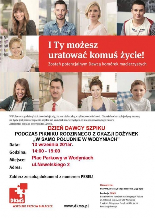 13 września w godzinach 14.00 – 19.00, podczas pikniku rodzinnego z okazji Dożynek „ W samo południe w Wodyniach” na Placu Parkowym przy ul. Newelskiego 2 wolontariusze będą rejestrować chętnych na potencjalnych dawców szpiku.