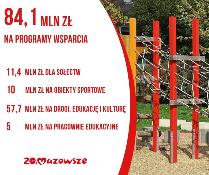 Radni województwa mazowieckiego zatwierdzili przyznanie dofinansowania w ramach programów wsparcia. Rozwój bazy sportowej, nowe pracownie informatyczne i językowe, aktywizacja sołectw czy modernizacja dróg powiatowych i gminnych oraz projekty edukacyjne i kulturalne to tylko część zadań, których realizacja będzie możliwa dzięki środkom samorządu Mazowsza. W sumie na ten cel przeznaczono blisko 84,1 mln zł.