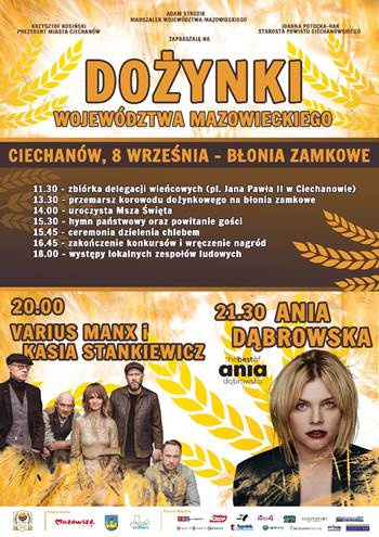 – Tegoroczne Dożynki Województwa Mazowieckiego, które odbędą się w Ciechanowie, będą niezwykłym wydarzeniem dla naszego miasta. Wydarzeniem bogatym w zwyczaje, tradycje, obrzędy oraz integrującym mieszkańców i przyjezdnych. Ponadto czekają nas koncerty świetnych artystów, gwiazd muzyki pop – Varius Manx i Kasi Stankiewicz oraz Ani Dąbrowskiej. Od południa do późnego wieczora będzie bardzo dużo się działo. Mamy nadzieję, że licznie odwiedzą nas delegacje z mazowieckich gmin i powiatów. Dokładamy wszelkich starań, by Dożynki Województwa Mazowieckiego były solidnie przygotowane zarówno w kwestiach logistycznych jak i programowych. Zadbamy o odpowiedni klimat wydarzenia i muzyczne wrażenia. Połączymy wiele rozmaitych akcentów i motywów – powiedział prezydent Ciechanowa Krzysztof Kosiński.
