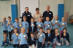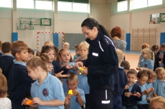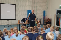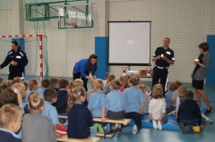 Bezpieczeństwo dzieci i młodzieży jest szczególnie istotne o tej porze roku, gdy warunki jazdy na drogach ulegają znacznemu pogorszeniu. Wcześnie zapadający zmierzch, mgła, śliska nawierzchnia to czynniki decydujące o bezpieczeństwie uczestników ruchu drogowego, a w tym tych najmłodszych podążających „do” i „ze” szkoły. Niebezpiecznych przykładów świadczących o istocie tego problemu jest wiele. Zdarzenia, w których poszkodowane są dzieci, nie pozostają bez reakcji policji. Analizując wszystkie zdarzenia z podległego rejonu siedleccy funkcjonariusze planują, a następnie przy współpracy z przedstawicielami społeczności lokalnej realizują szereg przedsięwzięć, mających na celu poprawę stanu bezpieczeństwa. Współpraca ze środowiskiem lokalnym jest gwarantem wysokiej jakości tych działań. W czasie dzisiejszego spotkania asp. szt. Janusz Cabaj z WRD oraz mł. asp. Edyta Barycka z Zespołu ds. Nieletnich KMP w Siedlcach rozmawiali z uczniami klas 0 - III o ich bezpieczeństwie, kładąc szczególny nacisk na bezpieczeństwo w ruchu drogowym. Uczestnikom przypomniano m.in. zasady przechodzenia przez ulicę po oznakowanym przejściu dla pieszych, a jedno z nich znajduje się właśnie obok szkoły przy ul. Sokołowskiej stanowiącej integralna część ruchliwej drogi krajowej 63.