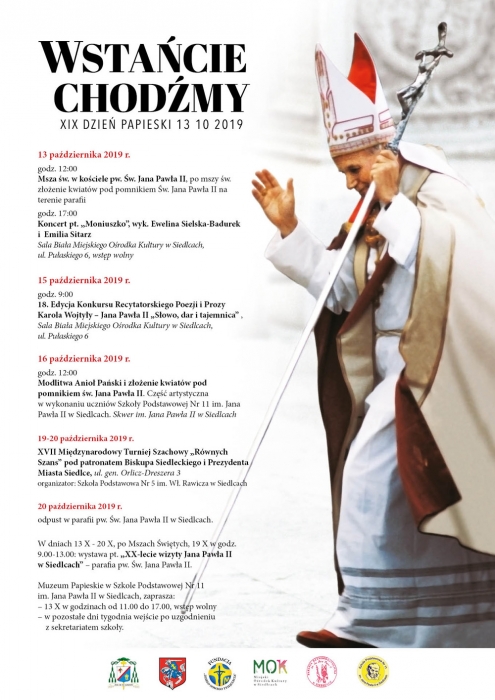 Jan Paweł II – Wstańcie Chodźmy. Pod takim hasłem, 13 października obchodzić będziemy jubileuszowy – XIX Dzień Papieski. W tym dniu, tradycyjnie w całej Polsce i poza jej granicami, organizowana będzie zbiórka na program stypendialny prowadzony przez Fundację „Dzieło Nowego Tysiąclecia”.