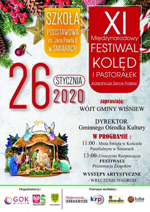 Wójt Gminy Wiśniew i Dyrektor Gminnego Ośrodka Kultury w Wiśniewie zapraszają na XI Międzynarodowy Festiwal Kolęd i Pastorałek "Kolędnicze Serce Polskie". Impreza odbędzie się w niedzielę 26 stycznia w Zespole Oświatowym w Śmiarach.