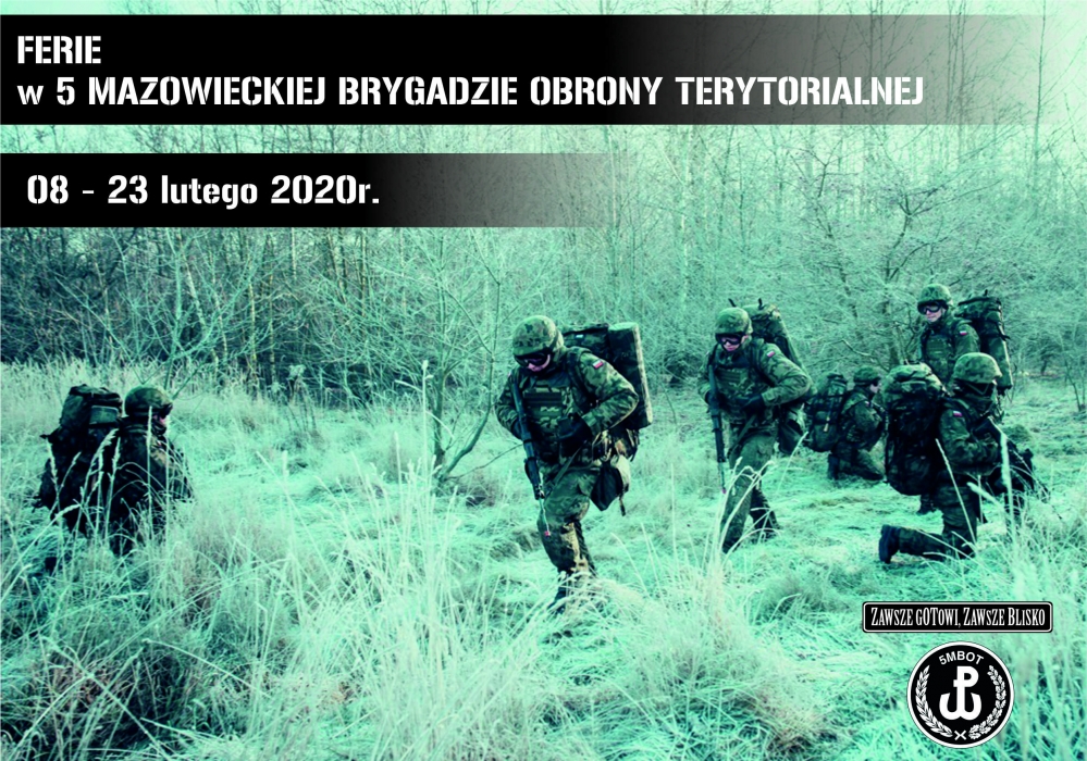 8 lutego 5 Mazowiecka Brygada Oborny Terytorialnej im. st. sierż. Mieczysława Dziemieszkiewicza rozpocznie kolejną edycję projektu Ferie w WOT. Szkolenie podstawowe organizowane w czasie wolnym od nauki jest przeznaczone głównie dla osób młodych, które uczą się i studiują. Skorzystanie z takiego rozwiązania pozwala bezkolizyjnie odbyć przeszkolenie wojskowe, bez potrzeby rezygnacji z nauki. Nowa forma służby jaką oferują Wojska Obrony Terytorialnej, czyli Terytorialna służba Wojskowa, pozwala na zbalansowanie służby z życiem osobistym i zawodowym.