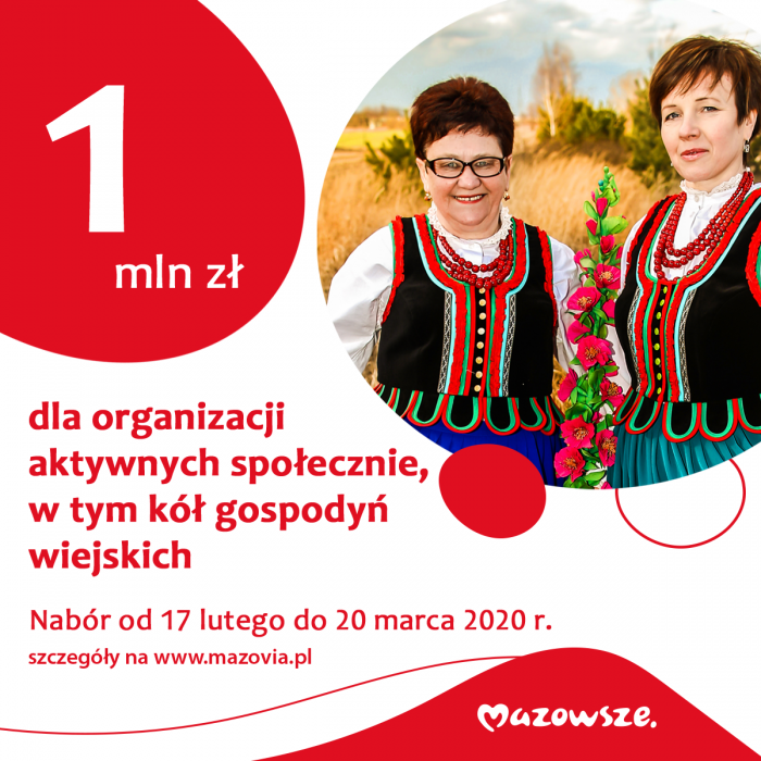 Samorząd Mazowsza ogłasza nabór dla aktywnych społecznie wspólnot i społeczności lokalnych. To szansa dla kół gospodyń wiejskich i innych organizacji pozarządowych na uzyskanie dofinansowania na zakup sprzętu i wyposażenia. Na ten cel z budżetu województwa przeznaczono ponad 1 mln zł. Wnioski można składać od 17 lutego do 20 marca br.