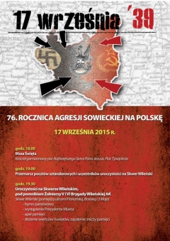 Uroczystości rozpocznie o godz. 18.00 Msza św. w kościele garnizonowym pw. Najświętszego Serca Pana Jezusa. Po zakończeniu Eucharystii uczestnicy uroczystości, poczty sztandarowe przejdą w zwartej kolumnie na Skwer Wileński. Kolumna przemaszeruje z Placu Tysiąclecia, ulicami Sienkiewicza i Floriańską pod pomnik Żołnierzy V i VI Brygady Wileńskiej AK. Tam, około godz. 19.30, rozpoczną się uroczystości rocznicowe, a wśród nich wystąpienie prezydenta Siedlec Wojciecha Kudelskiego, odczytanie apelu pamięci, złożenie kwiatów i zapalenie zniczy. Obchody 76. rocznicy agresji sowieckiej na Polskę uświetni Orkiestra Wojskowa Siedlce oraz młodzież z Publicznego Gimnazjum nr 3, która zaprezentuje okolicznościowy montaż słowno-muzyczny.