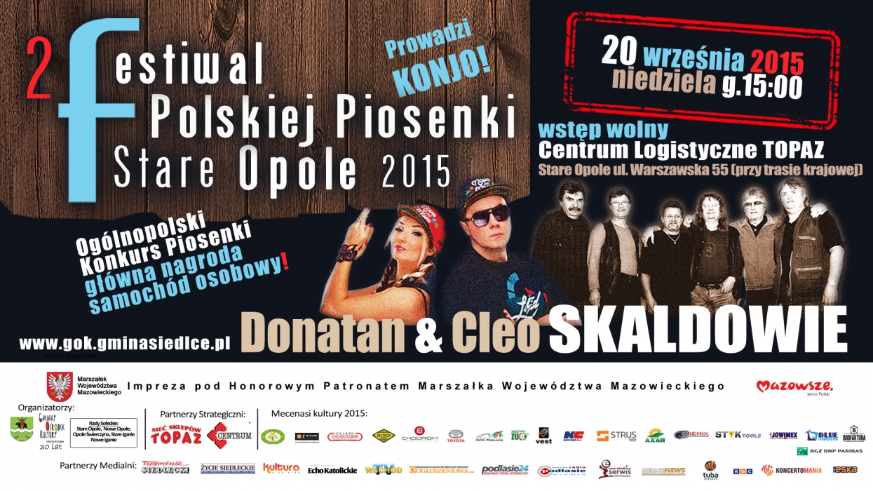 Już po raz drugi odbędzie się Festiwal Polskiej Piosenki w Opolu koło Siedlec. Impreza rozpocznie się o 15.00 , ale zmienia się miejsce koncertu na Centrum Logistyczne „Topaz” w Starym Opolu przy ulicy Warszawskiej 55, doskonale znane poruszającym się trasą na Warszawę - jako wcześniejsza baza logistyczna „Astra.