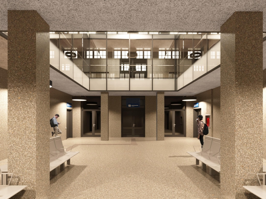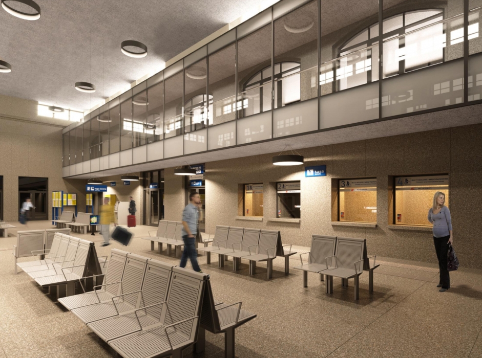 Sporo zmian czeka podróżnych wewnątrz budynku. Przestrzeń obsługi pasażerów będzie składała się z poczekalni i holu o wysokość dwóch kondygnacji, wokół których na dwóch piętrach skupiono pomieszczenia kas biletowych, toalety oraz lokale handlowo-usługowe. W projekcie parter budynku połączono z pasażem handlowym na piętrze za pomocą klatek schodowych oraz dwóch wind. Hol i poczekalnia zostaną wyposażone w ławki, gabloty z rozkładami jazdy, elektroniczne tablice przyjazdów i odjazdów pociągów oraz nowoczesny system informacji głosowej.