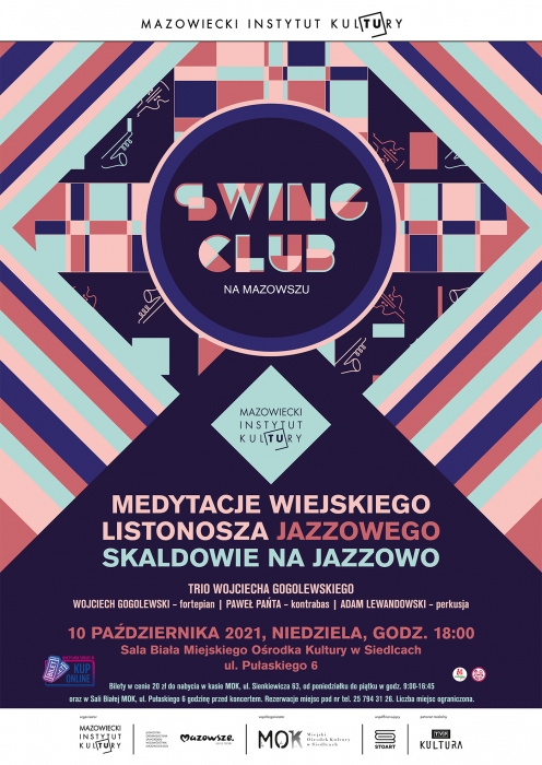Miejski Ośrodek Kultury w Siedlcach od 2016 roku należy do grona stałych partnerów Mazowieckiego Instytutu Kultury w realizacji Swing Clubu na Mazowszu. W 2021 roku w ramach cyklu w Siedlcach planowane są 2 koncerty. Pierwszy z nich odbędzie się w niedzielę, 10 października. W wykonaniu Trio Wojciecha Gogolewskiego zaprezentowany zostanie program „Medytacje wiejskiego listonosza jazzowego – Skaldowie na jazzowo”.
