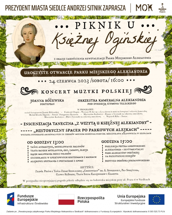 24 czerwca (sobota) o godz. 16:00 rozpocznie się „Piknik u Księżnej Ogińskiej” z okazji zakończenia rewitalizacji Parku Miejskiego Aleksandria.