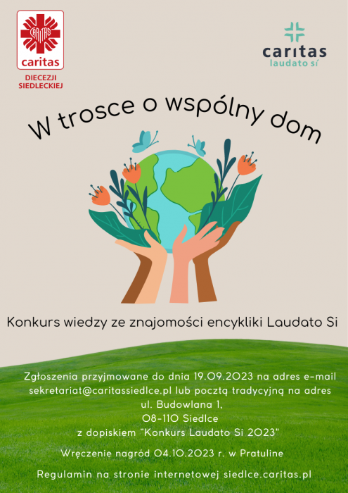 Caritas Diecezji Siedleckiej organizuje i zachęca do wzięcia udziału w konkursie wiedzy o encyklice „Laudato si - W trosce o wspólny dom”. Odbywa się on w ramach obchodów święta ekumenicznego „Czas dla Stworzenia 2023”. Chęć udziału należy zgłaszać do siedleckiej Caritas do 19 września 2023 r. do godz. 16:00. Na zwycięzców czekają nagrody.