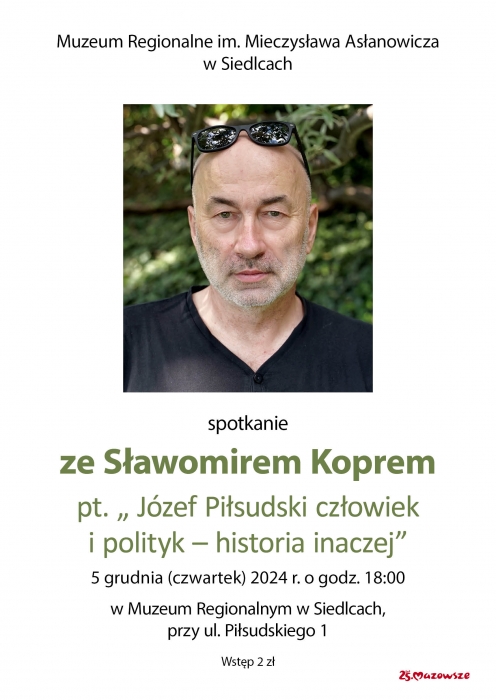 W czwartek 5 grudnia 2024 roku w Muzeum Regionalnym im. Mieczysława Asłanowicza w Siedlcach odbędzie się spotkanie ze znanym pisarzem Sławomirem Koprem pt. „Józef Piłsudski człowiek i polityk – historia inaczej”. Wydarzenie poprowadzi Krzysztof Chaberski.