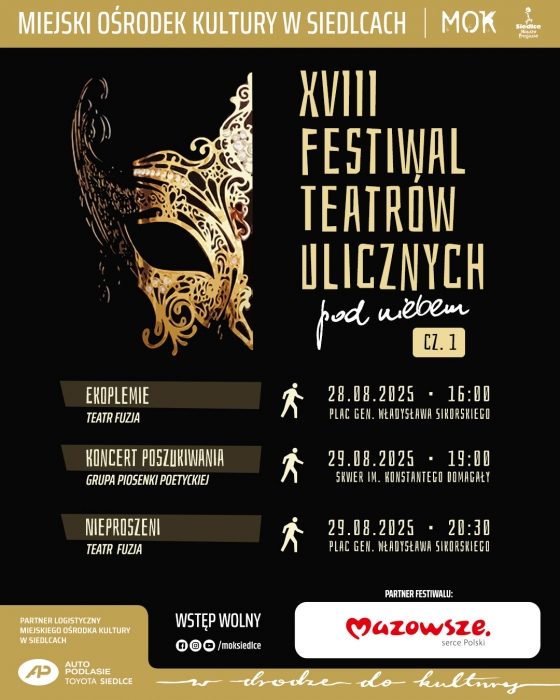 28-29 sierpnia Miejski Ośrodek Kultury w Siedlcach zaprasza na wyjątkowe spotkanie ze sztuką w przestrzeni miejskiej! Festiwal Teatrów Ulicznych „pod Niebem” to wydarzenie, które od lat przyciąga mieszkańców Siedlec i całego regionu, oferując niecodzienne widowiska pełne emocji, humoru, zaskoczeń i teatralnej magii – wszystko to na świeżym powietrzu, bez kurtyny i granic.