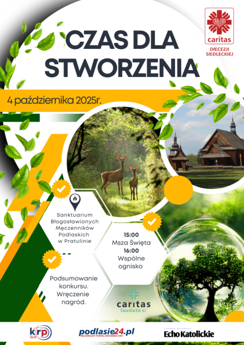 Msza święta, podsumowanie konkursu literackiego i wspólne ognisko czekają na wszystkich, którzy pojawią się 4 października 2025 r. (sobota) w Sanktuarium Błogosławionych Męczenników Podlaskich w Pratulinie z okazji ekologicznego wydarzenia pod hasłem „Czas dla Stworzenia”. Caritas Diecezji Siedleckiej pragnie w ten sposób uczcić św. Franciszka z Asyżu, patrona ekologów, miłośników przyrody i opiekunów zwierząt.