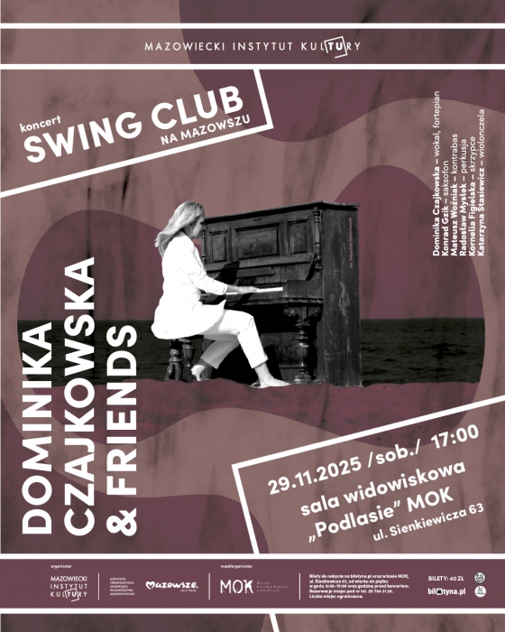 Trzeci koncert w tegorocznej edycji „Swing Club na Mazowszu” odbędzie się 29 listopada. W sali widowiskowej „Podlasie” wystąpi zespół Dominika Czajkowska & Friends. Będzie to niezwykłe wydarzenie, podczas którego artyści zabiorą słuchaczy w muzyczną podróż przez autorskie kompozycje, filmowe inspiracje oraz jazzowe interpretacje popowych hitów. Podczas koncertu usłyszymy utwory z debiutanckiej płyty „Północ”, prapremierowe kompozycje z nadchodzącego albumu oraz autorskie, jazzowe interpretacje utworów Beyoncé czy Dua Lipy. Jazzowy temperament i filmowa wrażliwość stworzą wieczór pełen muzycznych kontrastów.