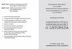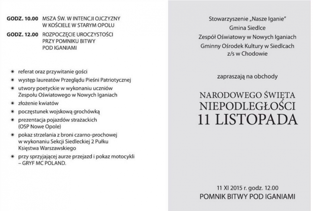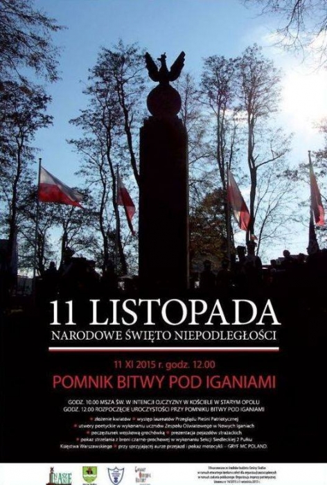 Świętowanie rozpocznie się o godzinie 10.00 mszą św. w intencji ojczyzny odprawioną w kościele w Starym Opolu. Po mszy o godzinie 12.00 rozpoczną się oficjalne obchody przy POMNIKU BITWY POD IGANIAMI, gdzie po uroczystym przywitaniu i referacie będzie można posłuchać pieśni patriotycznych w wykonaniu laureatów Przeglądu Pieśni Patriotycznej oraz uczniów Zespołu Oświatowego w Nowych Iganiach. Po złożeniu kwiatów na uczestników obchodów niepodległościowych czekała będzie gorąca grochówka.