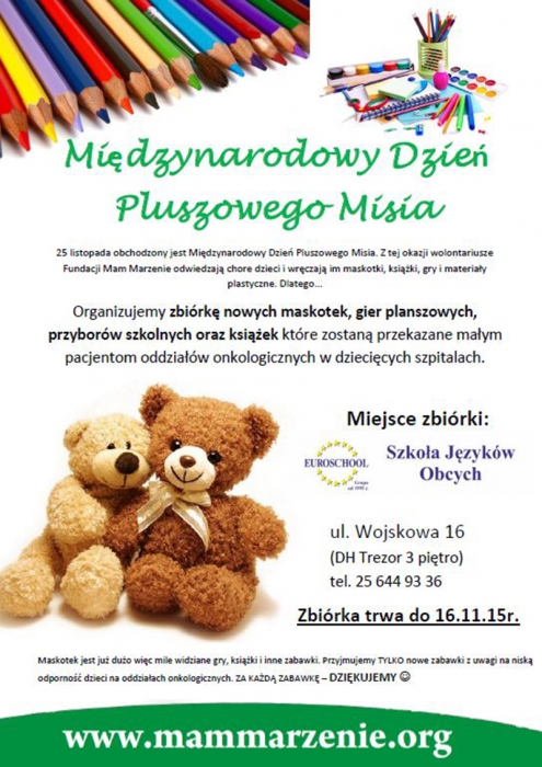 Z tej okazji wolontariusze Fundacji Mam Marzenie odwiedzają chore dzieci i wręczają im maskotki, książki, gry, zabawki i materiały plastyczne. Dlatego, jeśli możesz podarować nową rzecz dla tych maluchów, nie wahaj się!