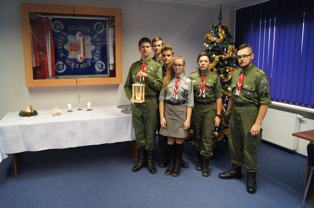 Wczorajsze spotkanie było również do przekazania przez harcerzy siedleckiej komendzie Betlejemskiego Światła Pokoju. Akcje tą zorganizowano po raz pierwszy w 1986 roku w Linz, w Austrii, jako część wielkich bożonarodzeniowych działań charytatywnych na rzecz dzieci niepełnosprawnych oraz osób potrzebujących. Akcja nosiła nazwę „Światło w ciemności” i była propagowana przez austriackie radio i telewizję. Związek Harcerstwa Polskiego uczestniczy w betlejemskiej sztafecie od 1991 r. W tym roku akcji przekazywania Betlejemskiego Światła Pokoju towarzyszą słowa „ZAUWAŻ CZŁOWIEKA”, a hasłem przewodnim są słowa z ewangelii wg. Mateusza (Mt 25,40): „Wszystko, co uczyniliście jednemu z tych braci moich najmniejszych, mnieście uczynili”. Tradycyjnie przekazanie Światła odbywa się naprzemiennie raz na Słowacji raz w Polsce. Tego samego dnia trafia ono do Krakowa i Częstochowy, skąd rozprzestrzenia się po całej Polsce, aby za pomocą rąk harcerek i harcerzy dotrzeć do wszystkich, którym bliskie jest przesłanie Betlejemskiego Światła Pokoju. Polska jest jednym z ogniw betlejemskiej sztafety. Harcerki i harcerze przekazują Światło dalej na wschód: do Rosji, Litwy, Ukrainy i Białorusi, na zachód do Niemiec, a także na północ do Danii. W tym roku Komendę Miejską Policji w Siedlcach odwiedzili harcerze z Hufca ZHP Podlasie. Delegacji harcerzy przewodził przyboczny Eryk Ługowski, a Betlejemskie Światło Pokoju z rąk harcerzy odebrał Komendant Miejski Policji w Siedlcach mł. insp. Marek Fałdowski.