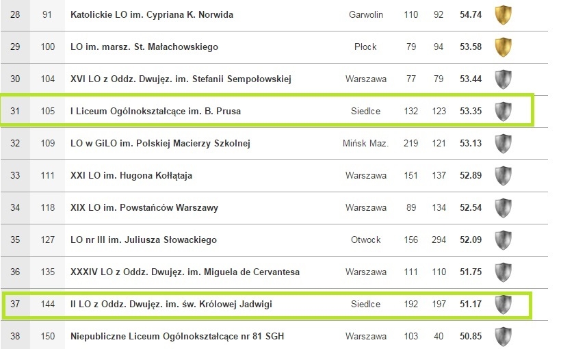 Na liście 500 najlepszych polskich liceów w tegorocznym rankingu "Perspektyw" znalazły się siedleckie licea Prus i Królówka. I LO im. B. Prusa sklasyfikowane zostało na 105 miejscu w kraju, a II LO z Oddz. Dwujęz. im. św. Królowej Jadwigi znalazło się na 144 miejscu. Obie szkoły w stosunku do wyników z ubiegłego roku poprawiły swoje lokaty.