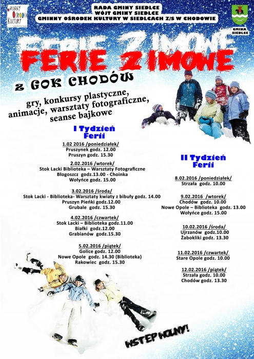 W województwie mazowieckim już rozpoczęły się ferie zimowe. W czasie ich trwania Gminny Ośrodek Kultury w Chodowie zaprasza do skorzystania z zajęć zaplanowanych na obiektach Gminy Siedlec.